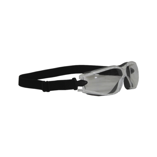 Óculos de segurança , modelo ampla visão constituído de lentes em policarbonato com armação em plástico rígido, acabamento interno em borracha e tirante de elástico.